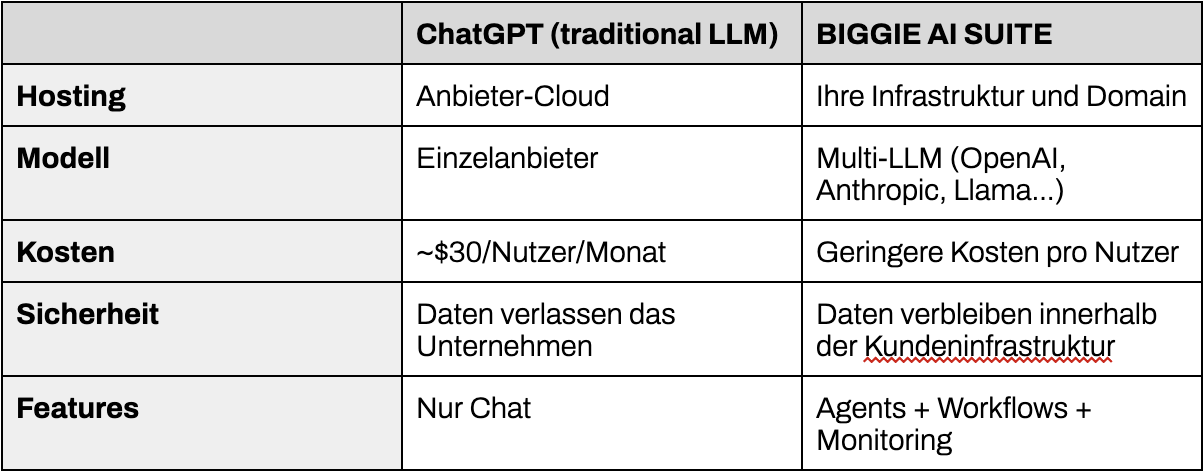 Die BIGGIE AI SUITE ist eine Multi-LLM-Infrastruktur, die entwickelt wurde, um diese Einschränkungen zu überwinden. Sie verbindet sich nahtlos mit mehreren LLMs, darunter OpenAI, Anthropic, Mistral, Llama und weitere. Da sie direkt auf deiner eigenen Infrastruktur und Domain gehostet wird, behältst du die volle Kontrolle über deine Daten. Gleichzeitig sind die Kosten pro Nutzer niedriger als bei herkömmlichen SaaS-Abonnements, und die Suite erfüllt sämtliche Anforderungen an GDPR, revDSG und Enterprise-Sicherheitsstandards.
